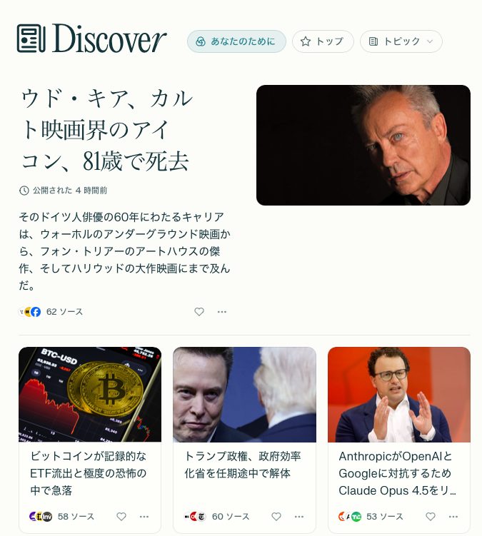 他社と違うのはDiscoverがあるところ。これは要するに「ニュースをAIでまとめてみた!」という感じのもの。中を開くと要約元のソースを出してくれる。